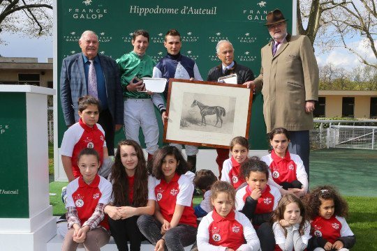 Les lauréats du Grand Prix des Jeunes Jockeys - Attawo associé à Maximilien Farcinade et l'entraîneur M.Pascal Adda.