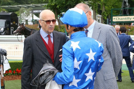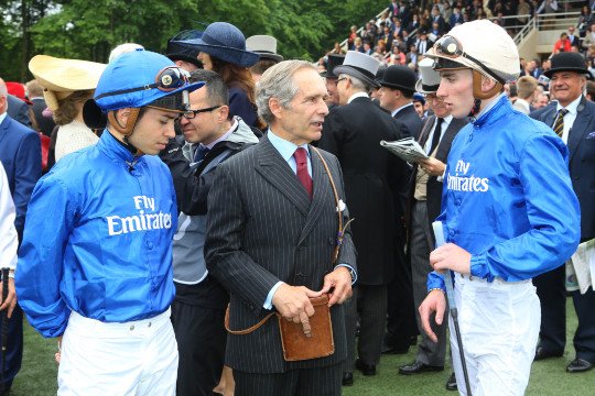 L'avant match, M.André Fabre en discussion avec ses jockeys Pierre-Charles Boudot et Mickaël Barzalona