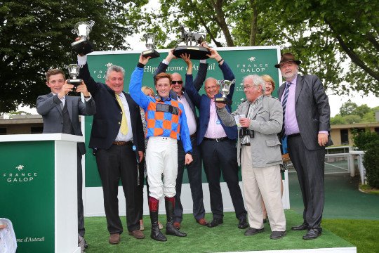 Ils sont venus, ils ont vaincu - M.Paul Nicholls et son jockey Sam Twiston-Davies et l'entourage de Ptit Zig sur le podium de la Grande Course de Haie d'Auteuil Gr.1