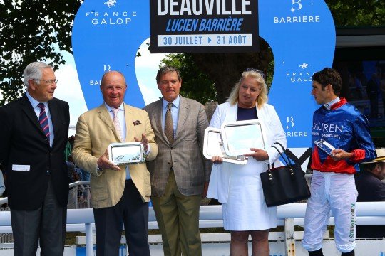 Le couple Leidel co-propriétaire était heureux de ce déplacement - ici aux côtés de M.Edouard de Rodschild, Lanfranco Dettori et l'entraîneur M.Wesley A Ward, lors de la remise des trophées