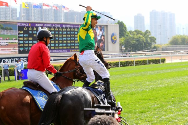 Les fans d'Aerovelocity sont salués par l'australien Zac Purton après sa victoire dans le Hong Kong Sprint