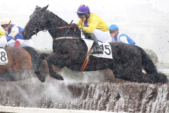 Malgré le froid, Alain de Chitray monte sans gants. Il va remporter le quinté d'Auteuil avec Red Rocky, entrainé par Jean-Paul Gallorini représenté ici par Florence, sa responsable