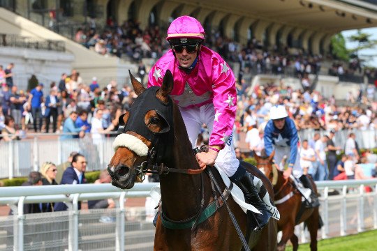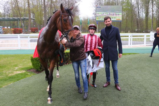 Charley Rossi, lui aussi, semble heureux ! Il flatte Boulevard (Galiléo), au retour de sa 4ème victoire de l'année, pour 4 sorties. Le Maurice de Nieuil (Gr. 2) pourrait être son prochain objectif.