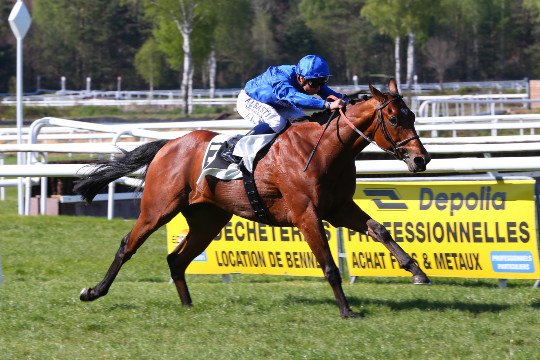 Jeudi, St-Cloud. Bay of Gibraltar (Rock of Gibraltar) fait briller les couleurs du Haras du Lieu des Champs pour la 1ère fois, ce qui fait très plaisir, visiblement, à Richard Powell.