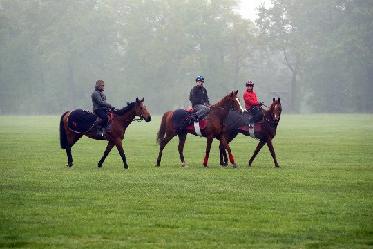 Le gazon des Aigles, ouvert depuis quelques semaines, donne lieu à certains préparatifs. Au centre, Called the Wind, sous l'oeil de Freddy Head, en selle sur son "poney", totalement à gauche du cliché