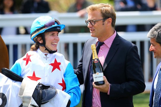 1er mai, St-Cloud. Alexis Teisseire, en bon Gentleman, n'offre pas de muguet, mais du champagne, à Diana Lopez-Leret, suite à sa victoire, en selle sur Ingrato