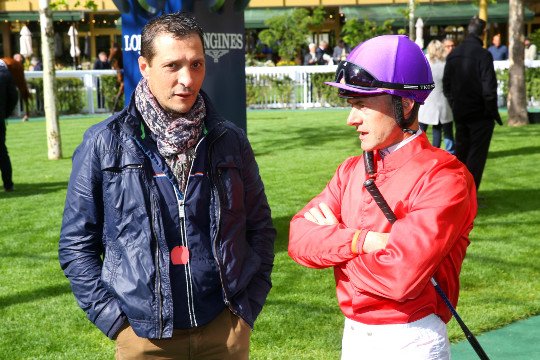Un papa sans doute heureux de son déplacement à Longchamp, Raphaël Delozier, en discussion avec Olivier Peslier, a pu voir Lukas gagner le Prix de la Seine.