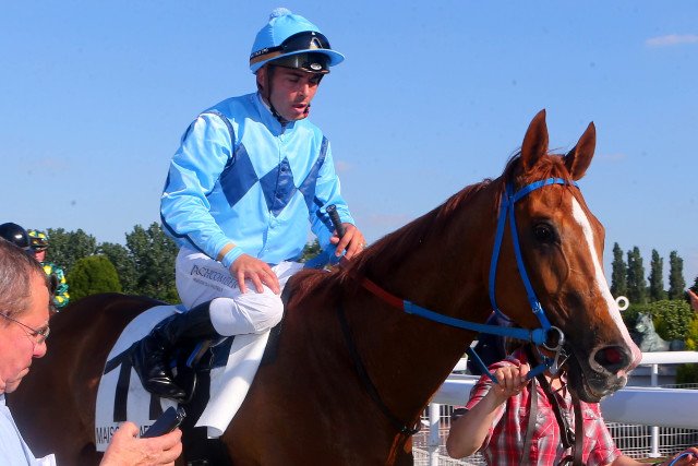La joie de Cristian Demuro au passage du poteau du Jockey Club. 2ème victoire pour le jockey italien, après Brametot, pour le même entraîneur