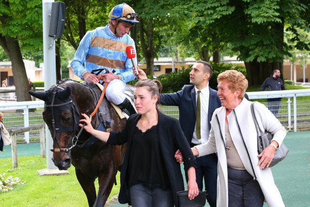 Isabelle Pacault accueille Jubilatoire et Jonathan Plouganou après leur victoire dans le Prix des Drags