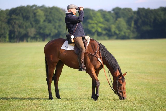 Alain de Royer Dupré, en selle sur son poney, Cent Ans, retraité de cross, surveille les derniers travaux de ses représentants, Siyarafina, en particulier
