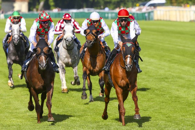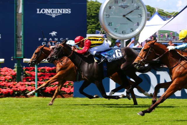 L'arrivé du Diane, de l'intérieur de la piste. Channel (Nathaniel) et PC Boudot résistent à Commes et Cristian Demuro, cachée. Jumelé inversé du Jockey Club, pour les jockeys