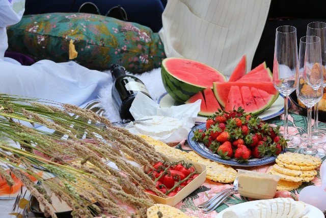Pique-Nique nature, à l'ancienne, mais avec couverts en argenterie et flûtes à champagne