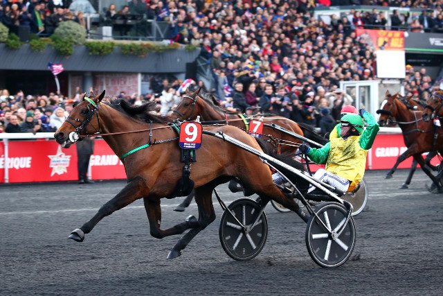 Face Time Bourbon, le jeunot de 5 ans, dame le pion aux autres concurrents de ce 100ème Prix d'Amérique, sur une courte et très forte accélération.