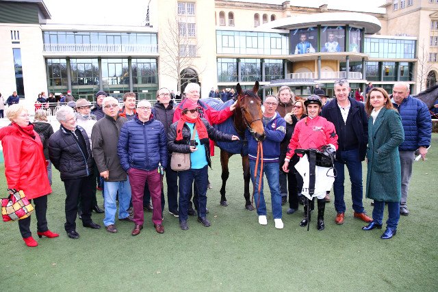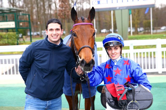 Crystal Miette réalise un très bon début d'année. Elle remporte sa 3ème victoire et offre la 1ère victoire de l'année à son Nicolas Bellanger, entraîneur, à gauche, entourant Rostylla (Rosendhal)