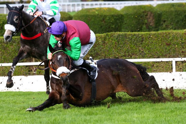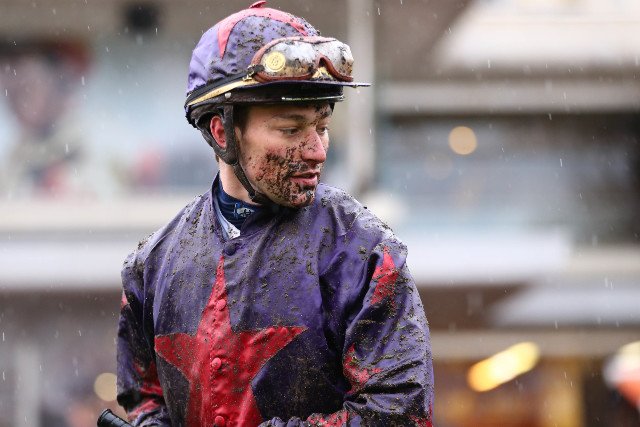 Le visage et la casaque de Gaëtan Masure témoignent des conditions extrêmes de ce dimanche à Auteuil.