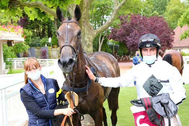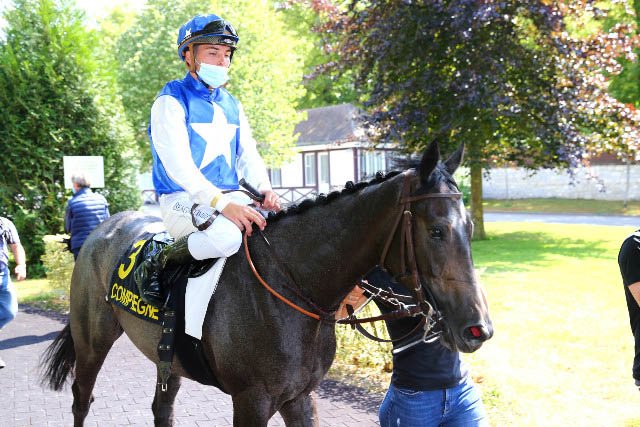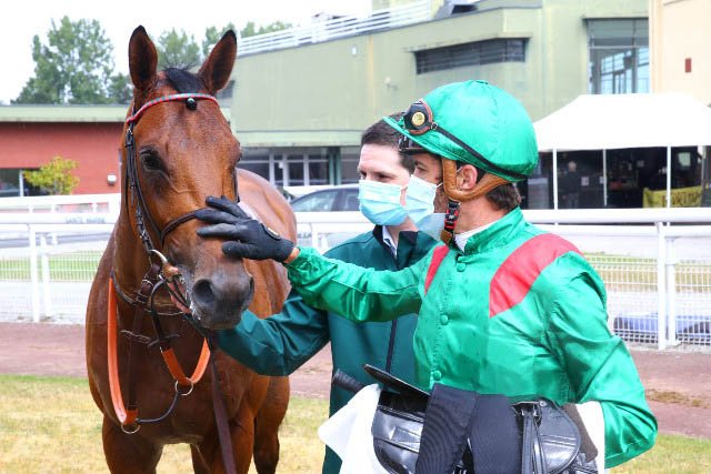 Christophe Soumillon flatte Zeyrek, le petit fils de Zarkava fait belle impression pour ses débuts en compétition.