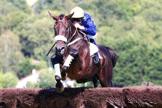 Arbarok et James Reveley au saut de la dernière haie sur l'hippodrome de Clairefontaine pour l'entraînement de Guillaume Macaire