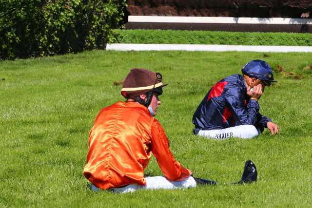 Les risques du métier... De temps en temps, les jockeys comptent les brins d'herbe...