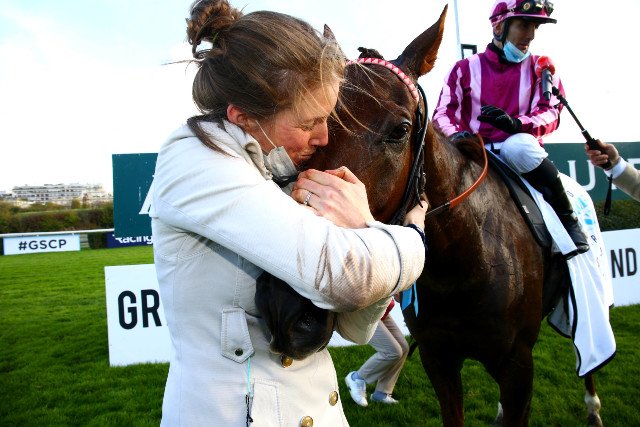 Moment de tendresse, sur la piste. Louisa Carberry enlace son représentant, Docteur de Ballon, lauréat du Grand Steeple Chase de Paris 2020