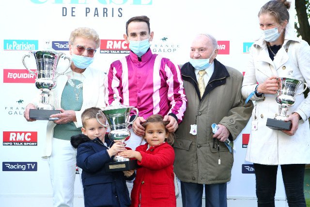 L'équipe gagnante de ce Grand Steeple : Mme et M. Gasche-Luc, éleveurs-propriétaires, encadrent Bertrand Lestrade, Louisa Carberry les accompagne. Sacha, le fils de Bertrand, semble tout aussi fier et heureux