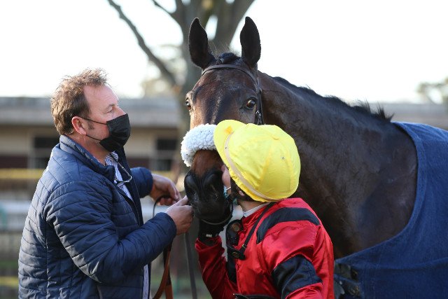 Lundi à Auteuil : la bise de Nathalie Desoutter à Feu Follet, qui lui offre une nouvelle victoire de Groupe, au lendemain de ses 40 ans