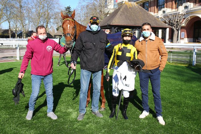 Samedi à Deauville : jeune entraîneur, ayant obtenu le sésame à l'automne dernier, Florain Guyader, à droite, s'offre son 1er gagnant grâce à About Midnight (Biraaj), sous la casaque Marnane, associée à Marie Vélon