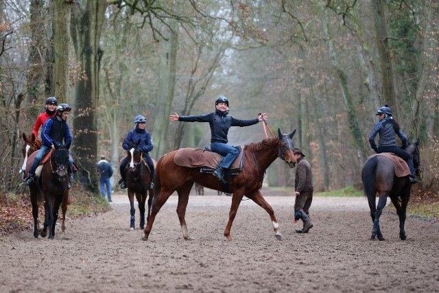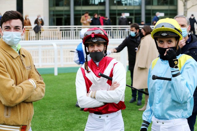 Mardi à Chantilly : les jockeys de la "Team Rouget", Simon Planque, Cristian Demuro et Coralie Pacaut