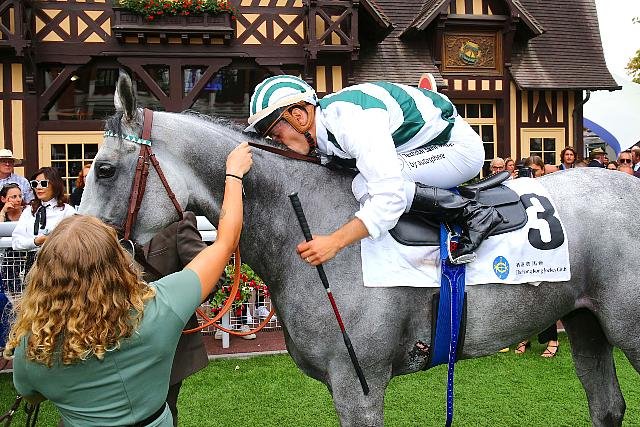 Dimanche à Deauville : le gros bisou de Cristian Demuro à l'un de ses chouchous Wally, après le Prix Gontaut-Biron (Gr.3)