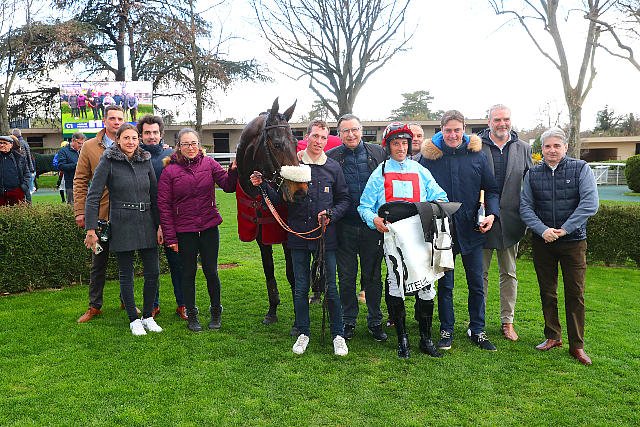 Dimanche à Auteuil : la casaque du trotteur Jean-Philippe Monclin (à droite du jockey avec la bouteille) brille pour la première fois à Auteuil