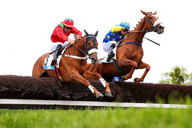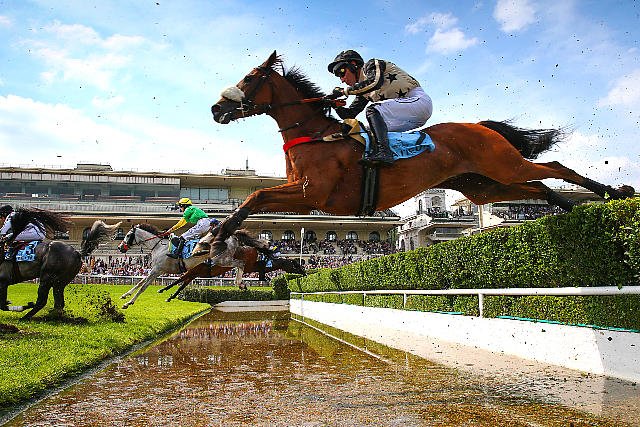 Dimanche à Auteuil :Johnny Charron avec Rosario Baron au saut de la rivière des tribunes dans le Grand Steeple Chase de Paris.