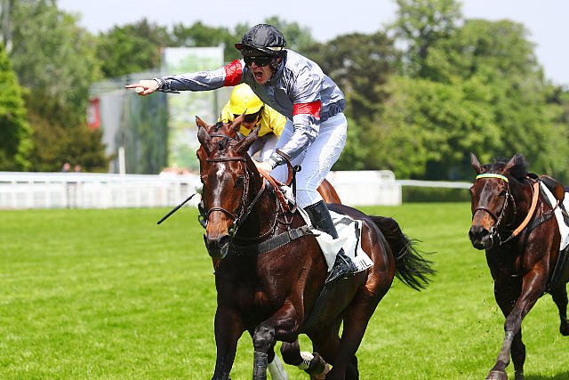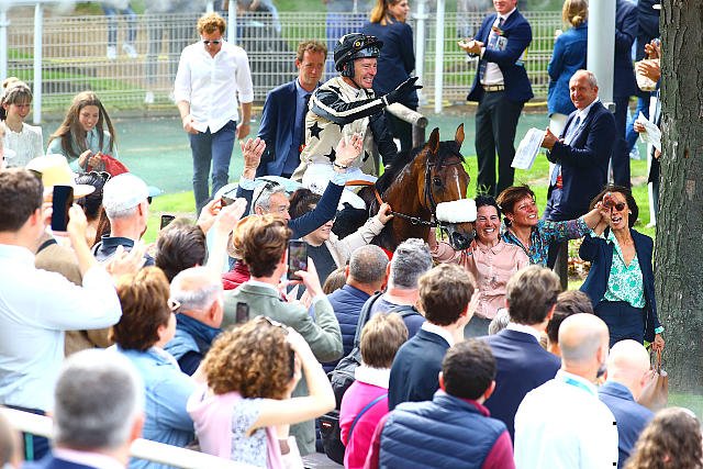 Dimanche à Auteuil : Johnny Charron la main en l'air pour célébrer la victoire du Grand Steeple avec le public et les professionnels.