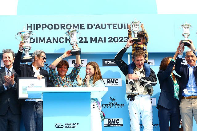 Dimanche à Auteuil : Johnny Charron et son fils ainsi que l'entourage de Rosario Baron soulevant le trophée du Grand Steeple Chase de Paris.