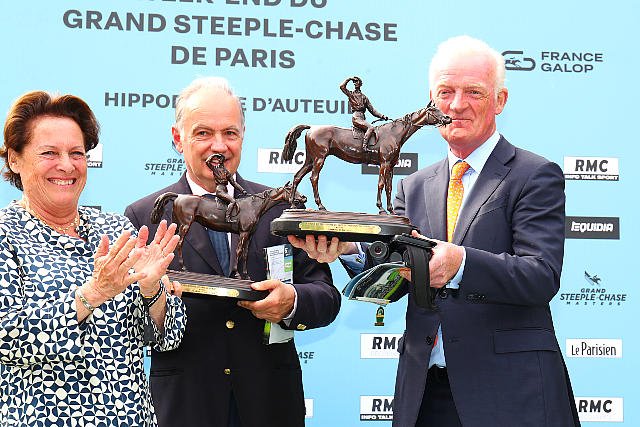 Dimanche à Auteuil : après la victoire de Gala Marceau dans le Prix Alain Du Breil (Gr.1), Willie P. Mullins, Pierre Boulard et Christine du Breil sur le podium.