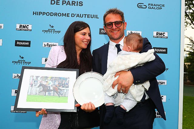 Dimanche à Auteuil : Mickael Seror accompagné sur le podium de sa femme et son bébé.