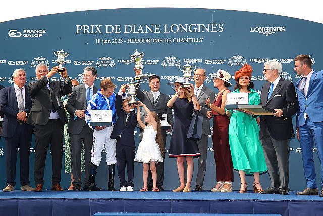 Dimanche à Chantilly : tout l'entourage de Blue Rose Cen brandit le trophée du Prix de Diane Longines (Gr.1).