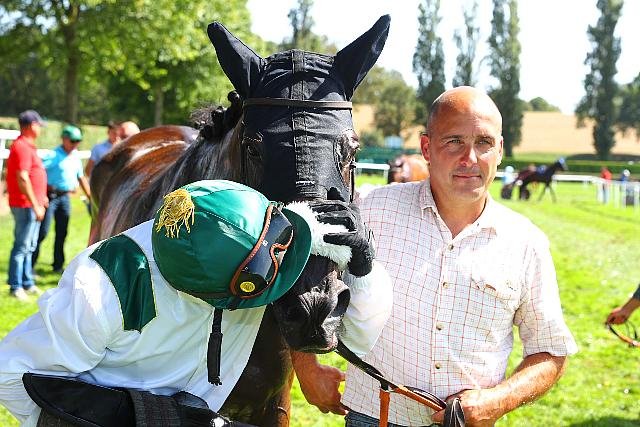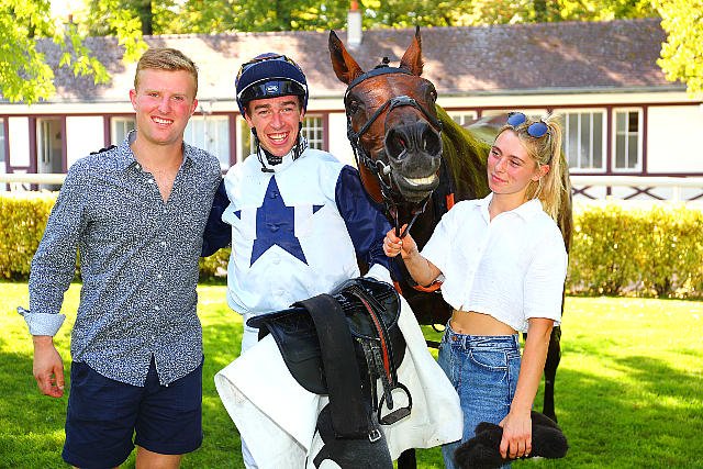 Vendredi à Compiègne : les sourires de Noel George et Nicolas Gauffenic après le succès du papi Clondaw Castle dans le Prix The Stomp (L.)