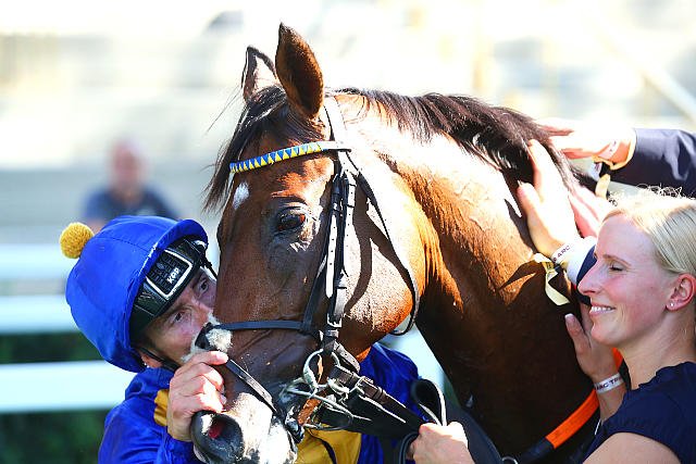 Dimanche à Longchamp : René Piechulek embrasse son champion Fantastic Moon après son brillant succès dans le Prix Niel (Gr.2)