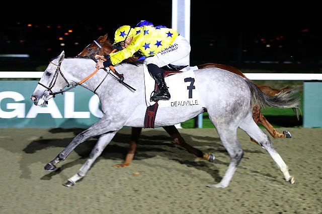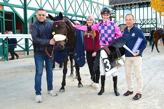Vendredi à Saint-Cloud : le poing levé de Frida Valle Skar au passage du poteau. Larno, cet attachant gris,, remporte la 14e course de sa carrière