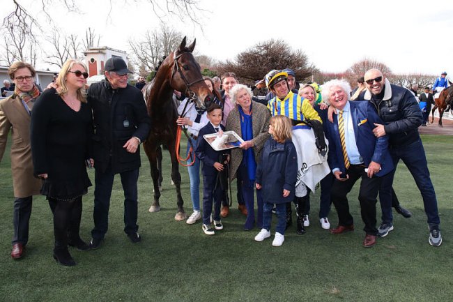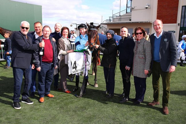 Samedi à Saint-Cloud : les associés de l'écurie de groupe anglaise Highclere célèbrent la victoire de Chic Colombine dans le Prix La Camargo (L.)