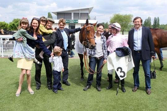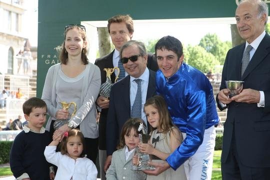 Le podium de la victoire pour Beauty Parlour : Christophe Soumillon, Ellie Lellouche, David Wildenstein et Bertrand Bélinguier