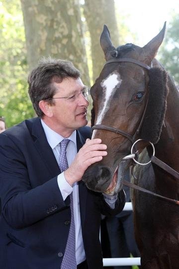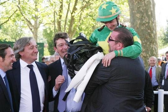 Stéphane Pasquier félicité par Anthony Forde après la victoire de Lucayan dans la Poule d'Essai des Poulains
