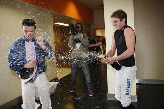 Alain de Chitray explose sa joie au passage du poteau avec Teejay Flying dans le Prix Ferdinand Dufaure (Gr.1)