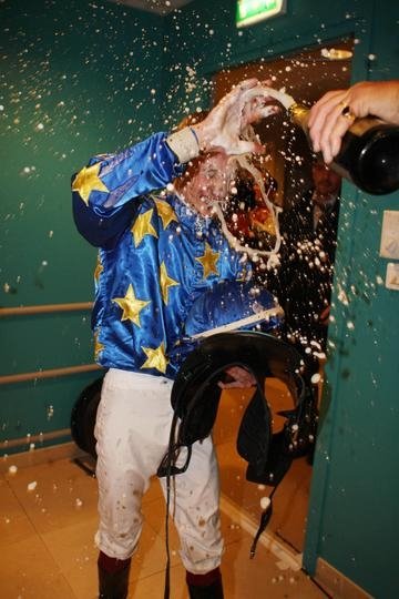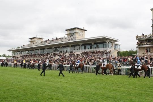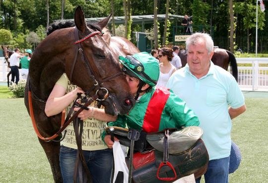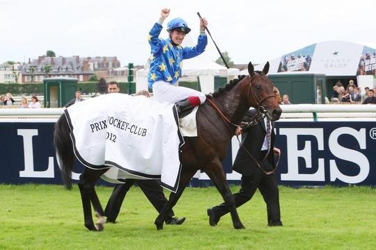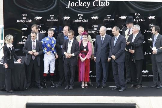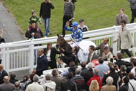 Saônois et Antoine Hamelin rentrent au rond de présentation après leur victoire dans le Jockey Club