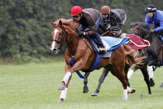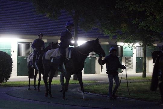 Le concurrent japonais Orfevre et Christophe Soumillon pour leur préparation à l'Arc