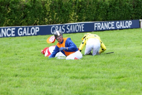 Le pire des moments pour un jockey du Grand Steeple. Alors qu'il monte l'un des meilleurs chevaux, il se retrouve à terre après le Rail-Ditch. Ici Jérôme Zuliani pour Polar Rochelais, Benoit Gicquel pour Farlow des Mottes et Alexis Acker pour Full Jack.