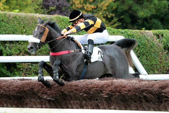 La joie au passage du poteau, de Christopher Couillaud en selle sur Rivaliste, pour l'entraînement de M.Philippe Lefevre à Auteuil