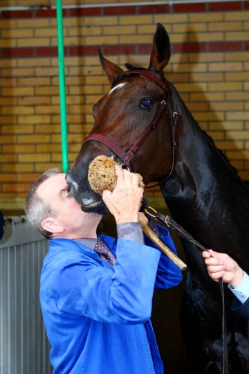 La joie de M.Julian Smart, l'entraîneur de Djainka des Forges s'imposent dans le Prix Qatar Arabian World Cup Gr.1 - Jockey Christophe-Patrice Lemaire