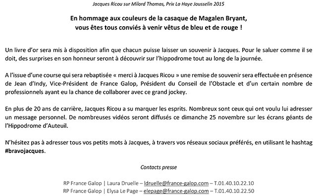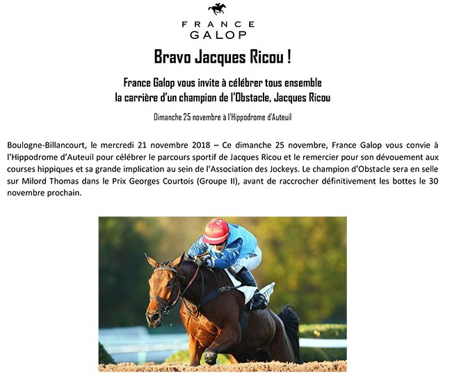 France Galop célèbre Jacques Ricou le 25 novembre à Auteuil