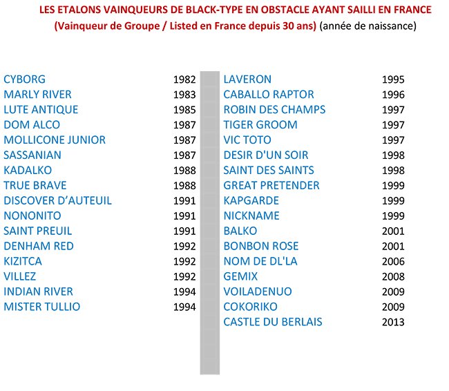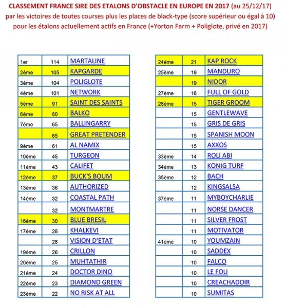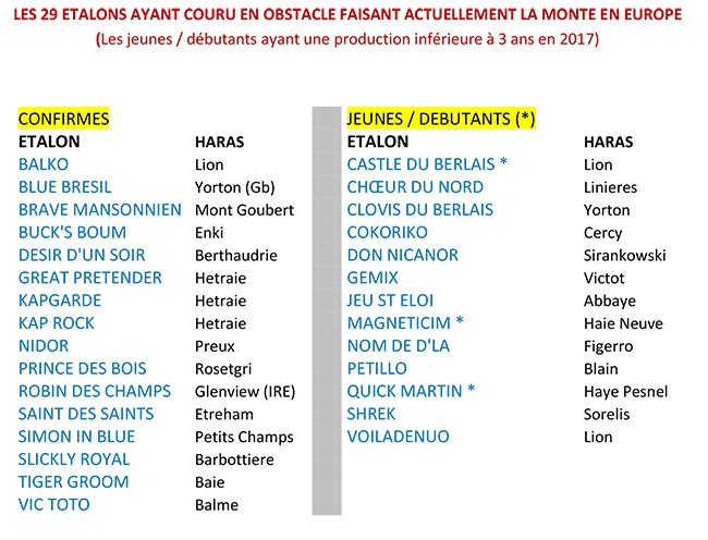 Au quasi terme de l'année 2017, alors que les étalons sauteurs sont infiniment moins nombreux que les chevaux de plat au haras, 4 sauteurs figurent dans le top 10 des étalons d'obstacle en Europe, selon le classement France Sire. La tendance serait comparable selon les chiffres de France Galop, mais il nous a semblé qu'il serait plus judicieux de prendre en compte les résultats en Angleterre et en Irlande, tant ils sont devenus importants, et en même temps de se concentrer sur les étalons encore actifs, à l'exception donc des morts et des retraités.