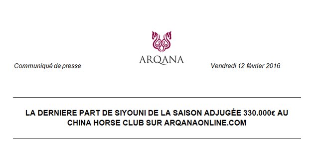 Après les beaux succès des précédentes ventes, Arqanaonline poursuit avec la mise aux enchères d'une 4ème part de l'étalon vedette Siyouni. Rappelons que les...